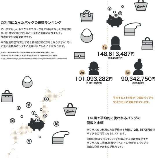 2025年(令和7年)2月23日、ラクサス・テクノロジーズ株式会社(本社:広島県広島市、代表取締役:高橋啓介)は、ブランドバッグのシェアリングサービス「ラクサス」がサービス開始から10周年を迎えたことをお知らせいたします。この10年間、私たちは「誰もが気軽に、憧れのバッグを楽しめる世界」を目指し、業界をリードしてまいりました。当社のサービスをご利用いただいている皆様、お取引先様、株主様をはじめ、創業以来支えてくださったすべてのステークホルダーの皆様のご支援により、ここまで歩むことができました。心より感謝申し上げます。皆様に感謝を込めて「Amazonギフト、HERMESのツイリーが当たる!キャンペーン」の内容と共に、これまでの歩みを振り返るインフォグラフィックスを公開いたします。
