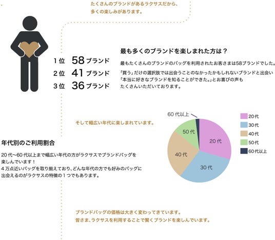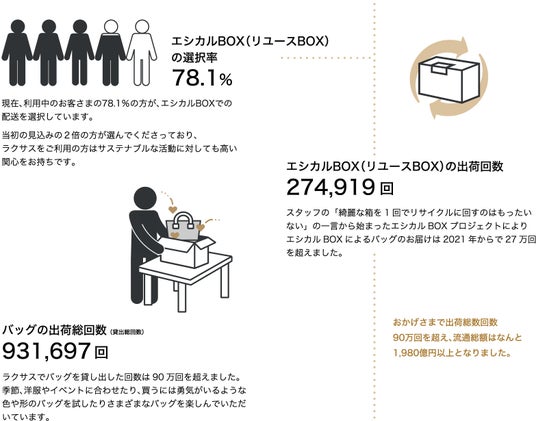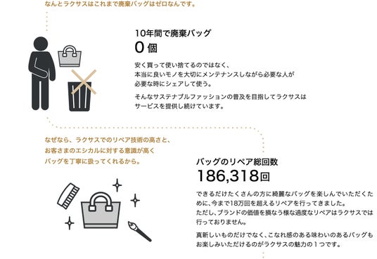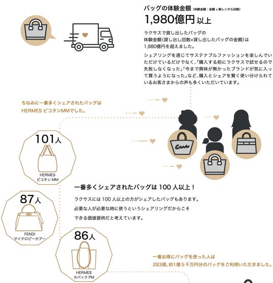 2015年にスタートしたラクサスは、ブランドバッグを「所有」ではなく「共有する」という新しい価値観を提案し、社会に革新をもたらしてきました。当社は、2006年の創業以降、「本当に良いものを愛し、作り手の想いをつなげたい。」「あこがれをみんなでシェアしたい。」という想いから、「世界中に笑顔を」を経営理念に事業に取り組んでまいりました。ラクサスは、これからも「より良いバッグ体験」を提供し、すべての人が自由にオシャレを楽しめる世界を目指して進化を続けてまいります。今後ともご期待ください。