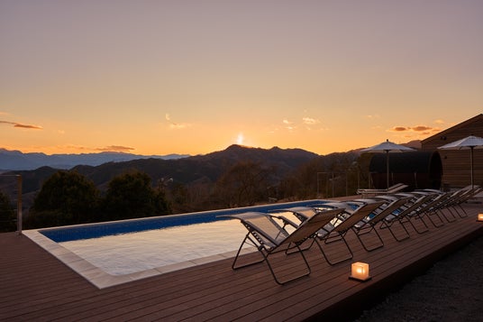 6棟のコテージの中央に位置し、秩父の景色を一望できるプールとバレルサウナ。四季折々に変化する自然の中で、まるで自分もその一部になったかのような感覚を味わうことができます。