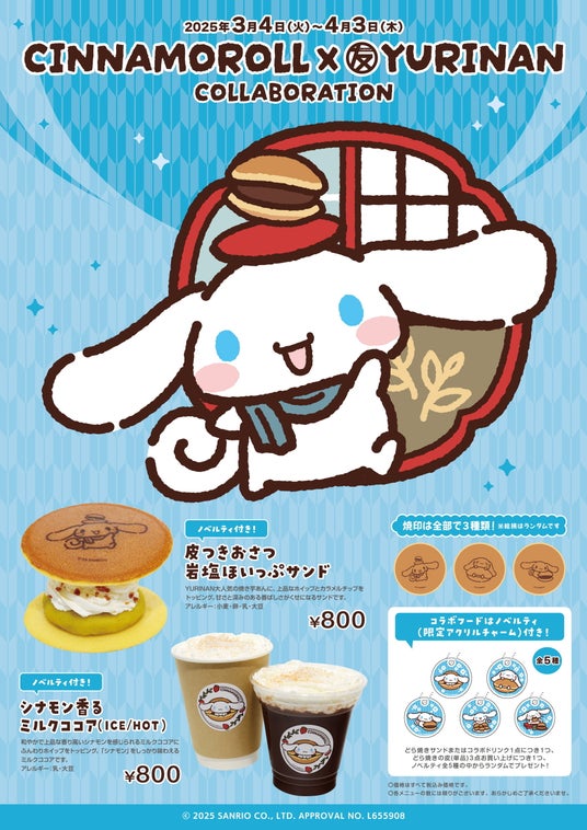 YURINAN では、3月4日(火)から「シナモロール」とコラボしたどら焼きサンドやドリンク、グッズを発売いたします。