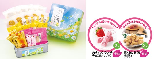 もち吉の人気商品と春限定商品を詰め合わせたボリュームたっぷりのギフト缶「そよ風だより」は、いちごの香りが春の訪れを感じさせる「あられクランチチョコ いちご味」と昆布の旨味と梅味が絶品の「素材の餅味 梅昆布」が入っています。