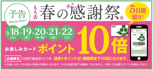 日頃の感謝の気持ちを込めて、「もち吉 春の贈りもの」イベント期間のうち5日間限定で、もち吉初となるポイント10倍キャンペーンを全国の直営店舗で実施します。