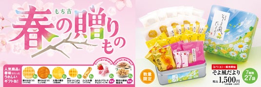 株式会社もち吉(本社:福岡県直方市、代表取締役社長:森田恵子)は、春のギフトシーズンにあわせて、「もち吉 春の贈りもの」イベントを3月1日(土)から全国の直営店舗で一斉に開催します。あられ・おせんべいの詰合せ商品や春限定商品の発売のほか、もち吉初となるポイント10倍キャンペーンを3月18日(火)から22日(土)の5日間限定で実施します。