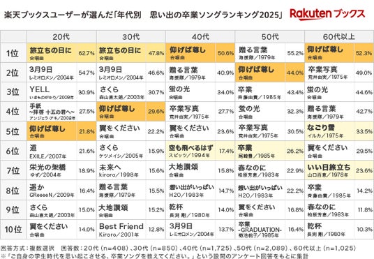 楽天グループ株式会社が運営するオンライン書店「楽天ブックス」は、3月の卒業シーズンに向けて、「楽天ブックス」ユーザー6,104名を対象としたアンケートを実施し、その結果をもとに「年代別 思い出の卒業ソングランキング2025」を本日発表しました。