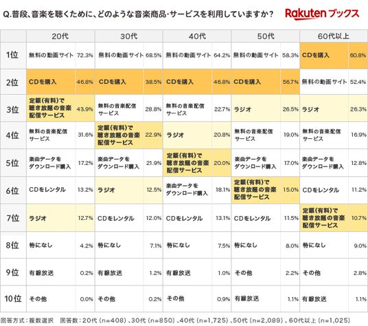 「普段、音楽を聴くために、どのような音楽商品・サービスを利用しているか」と聞いたところ、各年代で「無料の動画サイト」「CDを購入」が上位になりました。音楽配信サービスが台頭する中でも、音楽を聴く手段としてCD購入が支持されていることが分かりました。