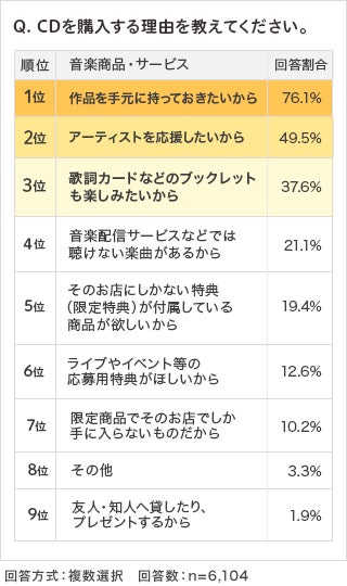 ・CDを購入する理由は、「作品を手元に持っておきたいから」(76.1%)が最多
