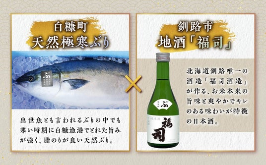 北海道東部に位置する人口約7,000人の白糠町(しらぬかちょう)は、豊かな自然環境に恵まれ、農業、林業、酪農・畜産業などが盛んな地域です。近年、同町で水揚げされる「ブリ」の漁獲量が増加し、「極寒ぶり(R)」として新たな名産品の一つに成長しています。このたび、白糠町の「極寒ぶり(R)」と、釧路市の地酒「福司(ふくつかさ)」(製造:福司酒造株式会社)をセットにした共通返礼品を新たに創出し、2025年3月上旬より、ふるさと納税のお礼の品として受付を開始します。白糠町と釧路市によるセットの共通返礼品提供は、今回が初めての試みとなります。