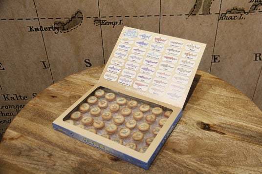 当館で飼育しているサメを中心に34種類のサメをモチーフにしたラングドシャです。箱の中にはそれぞれのサメの説明も書かれています。