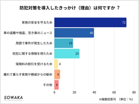 「家族の安全を守りたい」という自発的な防犯意識から対策を講じる方が大半でしたが、ニュースや隣人の空き巣被害など、何らかの事件の情報をきっかけに防犯対策を導入する方も一定数見られました。