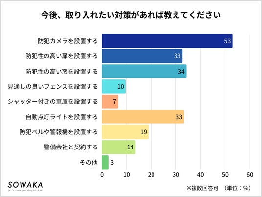 - 今後取り入れたい自宅の防犯対策は「防犯カメラの設置」や「自動点灯ライトの設置」