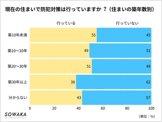 その結果、築年数が10年未満の住宅では防犯対を行っている方が50%を超えているのに対し、築年数が30年以上の住宅では防犯対策を行っていない方が38%に留まる事が分かりました。