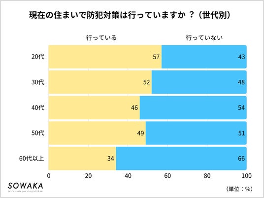 防犯対策状況について、世代別に回答を分類すると20代・30代では防犯対策を行っている方が50%を超えているのに対し、60代以上では防犯対策を行っている方が34%にとどまるという結果になりました。