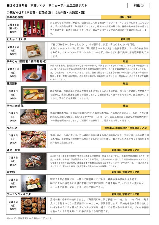 1月17日付プレスリリースにてご案内した、2025年春リニューアル各店舗の開業日について、