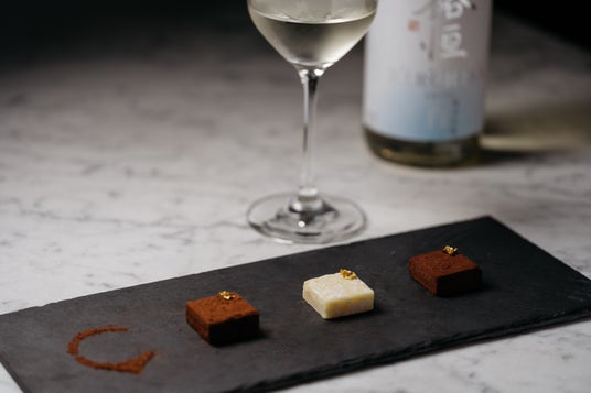 SDGsに配慮した商品開発の一環として、年間300kgも生み出されるという小松市の「西出酒造」の酒粕を活用し、ホテルオリジナルチョコレートが誕生しました。酒粕の芳醇な香りとチョコレートの風味が引き立てあい、シャンパンはもちろん日本酒とのマリアージュもおすすめです。ダーク・ミルク・ホワイトの3種をワンプレートで提供します。