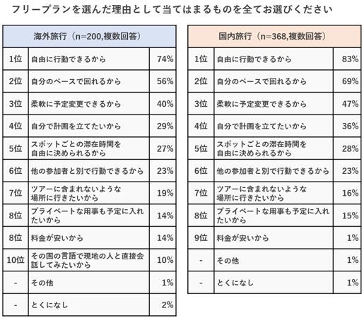 国内旅行においては、7割近くの人に支持されるフリープラン。ここでは、「フリープランを選んだ理由として当てはまるものを全てお選びください」という質問への回答結果を、数値を交えながら紹介していきます。