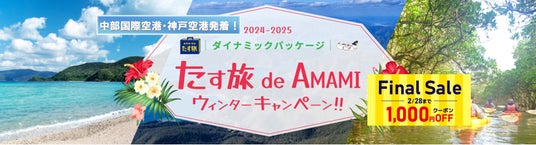 スカイパックツアーズ株式会社(本社:東京都中央区、社長:横山正巳)は、スカイマーク公式サイトで販売するダイナミックパッケージ「たす旅」で、「たす旅 de AMAMI ウィンターキャンペーン!!」を2024年12月5日(木)から2025年2月28日(金)までの期間限定で行っており、2月18日(火)10:00からは更に中部国際空港と神戸空港から出発する旅行も「ファイナルセール」の対象となり、1,000円OFFのクーポンをご利用いただけます。