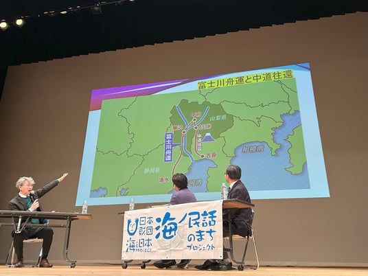 民話の主人公・弦間八兵衛が海へ向かったことから、江戸時代の山梨と海を結ぶ物流について解説した。塩の道となっていた富士川舟運と、海産物を運ぶ中道往還について図を使って伝え、海との物流経路が当時から生活に密着した大動脈であることを分かりやすく解説した。また、江戸時代から海のない山梨県に住む人々は海へのあこがれが強く、多くの生命を育む海に対して畏敬の念を持っていたことを挙げ、今も昔も変わらない海の重要性を伝えた。