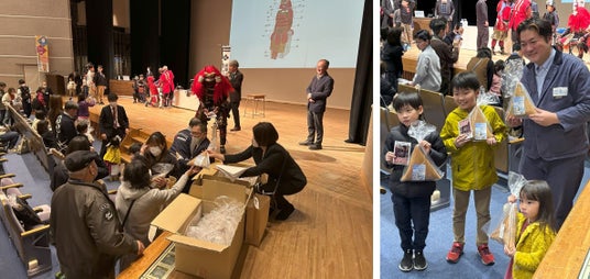 松林軒では、毎年節分の日に”がらがら”を販売。甲府市で節分の日に食べられる伝統的なお菓子・がらがらは、一辺が20cm程の三角形の焼菓子の中に鈴やおもちゃが入っており、振ると”ガラガラ”と音が鳴り、その音で鬼が驚いて逃げ出すとされている縁起物のお菓子。今回このがらがらを”海バージョン”で製作。焼菓子を磯の香り(塩と青のりを使用)に仕立て、中に入れるおもちゃをアニメーションにも登場するサメのフィギュアを子どもが大好きなガチャガチャカプセルに入れて包んだ特別バージョン。当日は、松林軒の店主も来てくださり、完成品ができるまでのご苦労など話してくださった。