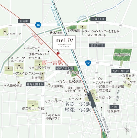 名鉄尾西線「西一宮駅」から徒歩1分、名鉄名古屋本線「名鉄一宮駅」からも徒歩9分という交通利便性に優れた立地に位置した単身向けのマンションです。周辺にはスーパーやクリニックに加え、公園などの緑も多く、利便性と自然の両方を享受できる豊かな住環境です。また一部のタイプには壁一面に可動棚収納を標準で設置しており、不足しがちな収納を十分に確保するだけでなく、より自分好みの空間を演出できる間取りも兼ね備えています。