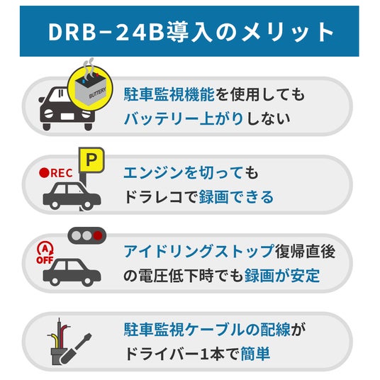 エンジン停止して駐車中でもドライブレコーダーを動かして当て逃げ、ドアパンチ、防犯にドライブレコーダーを活用するアイテム。当社ではドライブレコーダー用バックアップ電源を長時間用、短時間用とシリーズ化しています。
