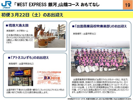運行初便の山陰エリア到着にあわせて、米子駅と出雲市駅でお出迎えを実施いたします。