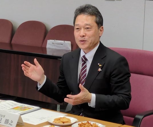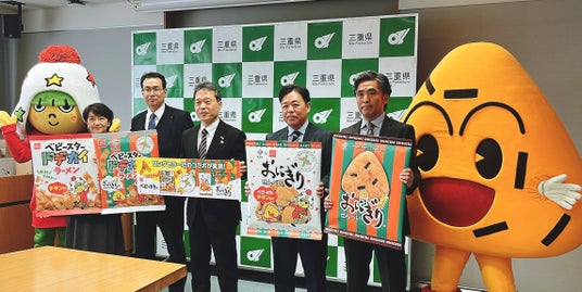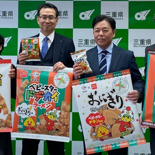 三重県のお菓子メーカーがタッグを組んで誕生した入れ替わりコラボ商品の発売にあたり、2025年2月20日(木)には、両社代表が三重県庁へ一見勝之知事を表敬訪問し、一見知事からは「子どもの頃から、ベビースターラーメンさんも、おにぎりせんべいさんも、三重県のものだと知らずに食べていた。既に全国区でご活躍いただいている両社が、(コラボ商品をきっかけに)三重県をさらに推していただけることに感激している。三重県としても最大限協力していきたい。」とのコメントをいただきました。