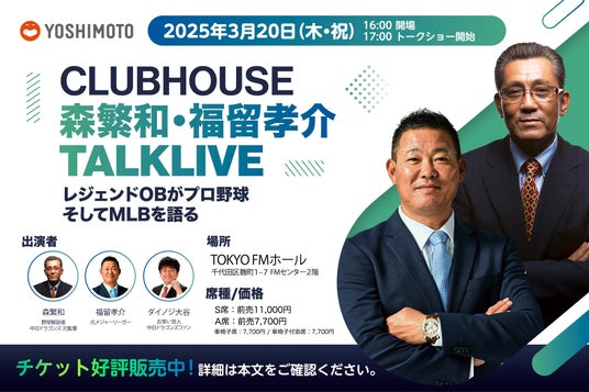 株式会社よしもとスポーツは、3月20日(木・祝)にTOKYO FMホール(東京都千代田区)で、「CLUBHOUSE」森繁和・福留孝介TALKLIVEを開催します。