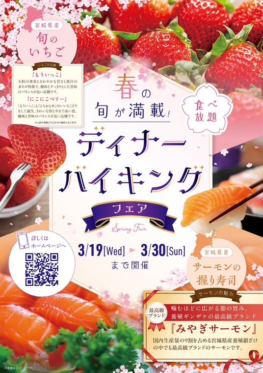 名古屋・仙台・苫小牧間でフェリーを運航する太平洋フェリー株式会社(本社:名古屋市中村区、名鉄グループ)は当社が運航する船舶「きそ」が就航20周年を迎えるのを記念して、2025年3月19日(水)~3月30日(日)の期間限定で船内レストランのディナーバイキングにおいて宮城県の仙台中央卸売市場から仕入れた「宮城県産いちご」と「宮城県産サーモン(みやぎサーモン)を使用した握り寿司」を提供いたします。