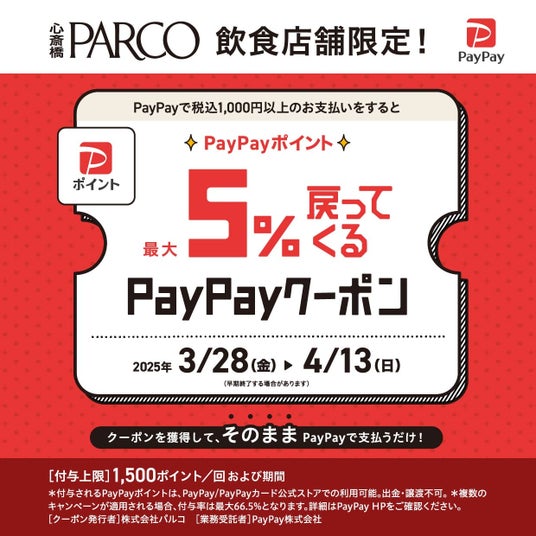 【心斎橋PARCO 飲食店舗限定】最大5%戻ってくるPayPayクーポン