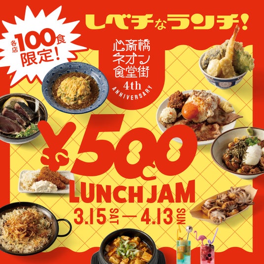 心斎橋PARCO地下2階「心斎橋ネオン食堂街」は3月18日(火)でオープン4周年を迎えます。食のみならず音楽やファッションが日夜問わず集まる他とはひと味違う食空間で一度は食べてみて欲しいという想いから、お得な500円ランチ企画やハッピーアワー企画などを中心に、1ヶ月間様々なイベントを開催いたします。