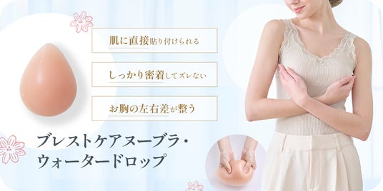 ブレストケアヌーブラ・ウォータードロップは、乳がんでお胸を切除された方のための人工乳房です。限りなくお胸に近い柔らかさと形状保持力を両立し、肌に貼り付けるだけの手軽さと簡単なお手入れで繰り返し使用できるところが魅力です。