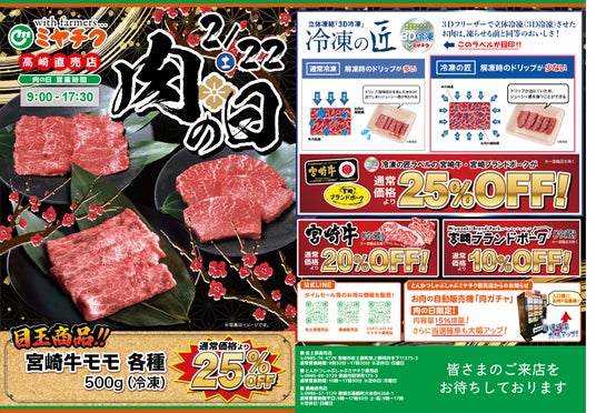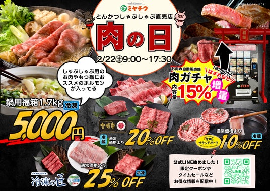 株式会社ミヤチク(本社:宮崎県都城市/代表取締役社長:船ヶ山 祐二)が運営する「宮崎牛」「宮崎ブランドポーク」「ハム・ソーセージ」を取り扱う直売店(宮崎県内3店舗)にて、2/22(土)にお肉が割引価格でお買い求めいただける「肉の日」を開催します。さらに!佐土原直売店では、15周年を迎え。お客様に感謝を込めた“感謝セール”も同時開催!