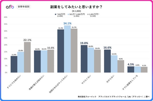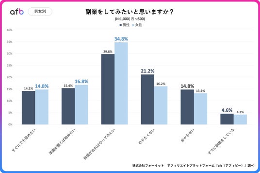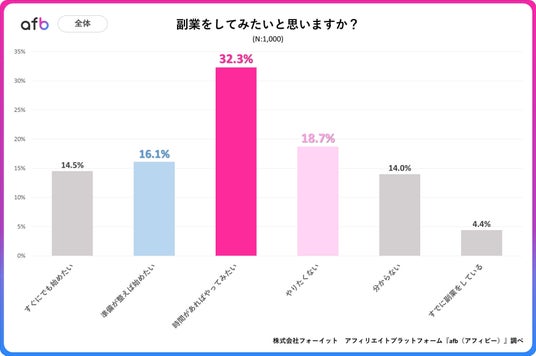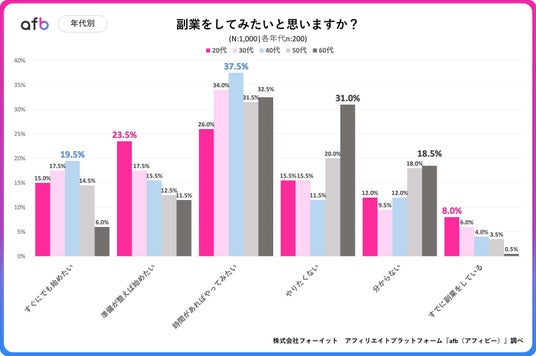 アフィリエイトプラットフォーム「afb(アフィビー)」< https://www.afi-b.com/ >の開発運用をおこなう株式会社フォーイットは、全国の20代~60代までの男女1,000人を対象に副業に関するアンケートを実施し、年代別等の特徴についてまとめました。