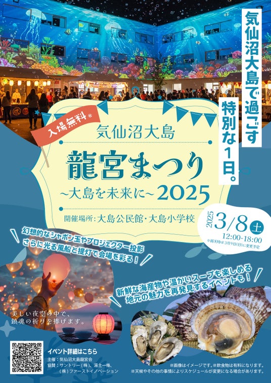 株式会社ファーストイノベーション(代表取締役社長:木ノ根雄志、以下ファーストイノベーション)は、地域漁業と共に歩む「宮城県東部沿岸部漁業者支援プロジェクト」に参画しています。本プロジェクトの第一弾として実施中の「龍宮プロジェクト」は、気仙沼大島 漁協青年部代表の小松さんがリーダーを務め、漁業を核とした地域全体の活性化に挑む感動的な取り組みです。今回、このプロジェクトを通じ、2025年3月8日(土)に気仙沼大島で「気仙沼大島 龍宮まつり2025 ~ 大島を未来に ~」のイベントを開催することが決定いたしました。