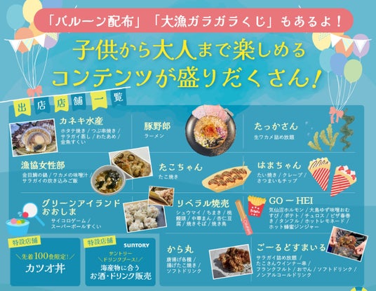 本イベントは、気仙沼の豊かな海産物や地域文化を楽しみながら、地域の未来を共に創ることを目的としています。「地元の漁師グルメ」や「定番の屋台グルメ」を楽しめる飲食販売コーナーをはじめ、豪華景品が当たる「大漁くじ大会」、気仙沼でしか味わえない「生ワカメの詰め放題」、「アカザラガイの詰め放題」チャレンジコーナーなど、さまざまなコーナーや企画を用意しております。フィナーレではシャボン玉とプロジェクター投影、風船による華やかな演出も行います。子供から大人まで楽しめるコンテンツが盛りだくさんのイベントです。