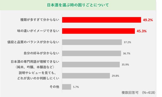 日本酒選びの困りごと「種類が多すぎて分からない 49.2%」「味の違いがイメージできない 45.3%」