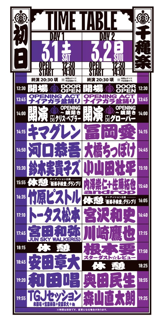 この度、両日のタイムテーブルを発表しました。初日のトリ・和田唱のパフォーマンスのあとは「TGJセッション」と銘打って、和田唱、宮田和弥、安田章大らによるスペシャルコラボパフォーマンスをお届けします。千穐楽の大トリは、おなじみの森山直太朗が締めくくります。