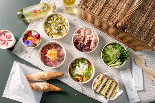 友人や家族など大切な人たちとともに日々の幸せや喜びを祝う「セレブレーション」をコンセプトに掲げる「ル・プリスティン東京」がご用意する、特別なお花見のひと時を演出する特製ピクニックバスケット。そのままお花見に出かけていただけるバスケットには、彩り豊かな春の味覚を楽しむシェアリングスタイルのメニュー9品とドリンクを詰め込みました。