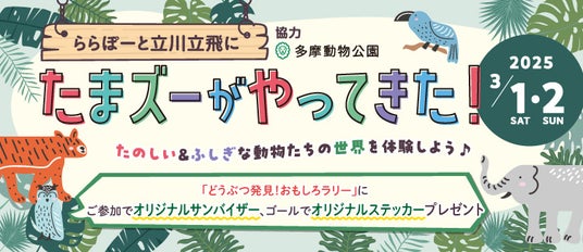 2025年3月1日(土)・2日(日)の二日間、多摩動物公園協力による動物のたのしさやふしぎが学べるイベントを開催いたします。この機会にららぽーと立川立飛へぜひお越しください。