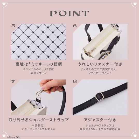 今回、Areeamから初のブランドムックを発売。ブランドで大人気のミッキーショルダーバッグが本誌限定でミルクカラーのキャンバス風素材となって登場。フロントに施された「ミッキーマウス」の手が印象的で、まるでぎゅっとカバンを抱きしめているかのようなかわいいデザインです。 また、スナップボタンが付いたハンドモチーフには、バッグとの間にテーマパークのカチューシャなどを挟める仕様となっており、ディズニー好きには欠かせないアイテムです。バッグの内側にはオリジナルバッグと同じく、「ミッキーマウス」の総柄デザインを使用しました。