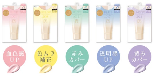 肌そのものの色ではなく、補色性質によって脚もとの肌悩みを補正する「PINK」「YELLOW」「MINT」「BLUE」「LAVENDER」の5色展開です。薄く色を重ねることで、はく人の素肌の色味を生かしながら脚の肌悩みを自然にカバーします。