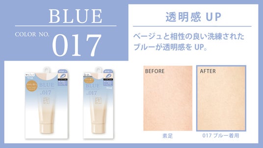 ベージュと相性の良い洗練されたブルーを肌に重ねることで、肌色を明るく見せ、自然な透明感を演出します。血色感を抑えながらトーンアップできることが特徴です。