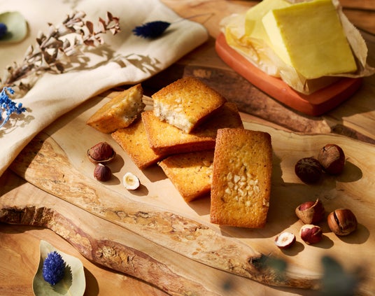 じゅわっとあふれるバターの濃厚な味わいと、香ばしいヘーゼルナッツのマリアージュが楽しめるフィナンシェ。表面に散りばめた、ローストしたヘーゼルナッツの食感と香りが、しっとり焼き上げた生地のおいしさを引き出します。
