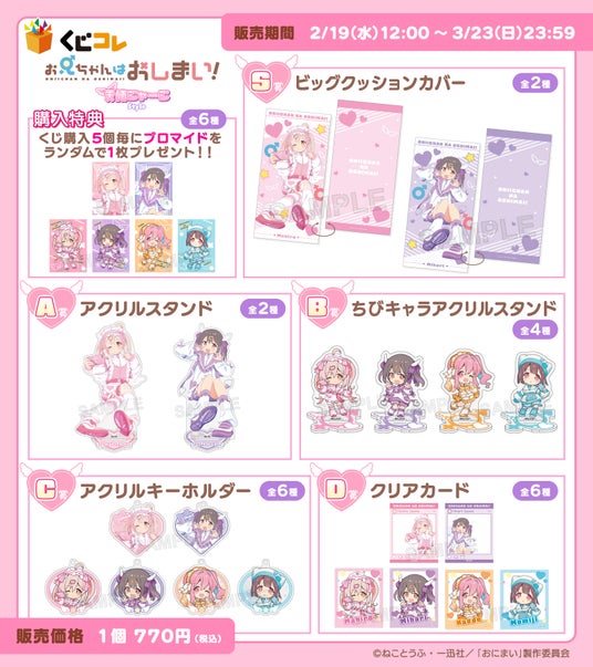 各賞の商品といたしましては、ビッグクッションカバー、アクリルスタンド、アクリルキーホルダー、クリアカードなどファンの皆様に喜んでいただけるラインナップとなっております。