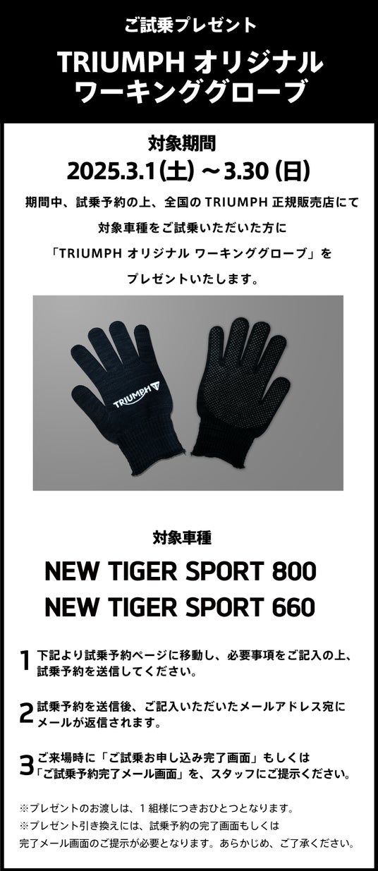 期間中、対象モデルの試乗予約をし、全国のTRIUMPH正規販売店にてご試乗された方に、「TRIUMPH オリジナル ワーキンググローブ」をプレゼントいたします。
