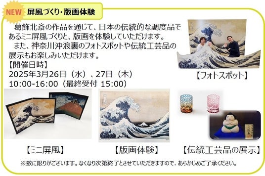 3月は、一般社団法人墨田区観光協会ご協力のもと、冨嶽三十六景などの浮世絵で有名な葛飾北斎の作品を通じた、屏風づくりや版画の体験を行います。