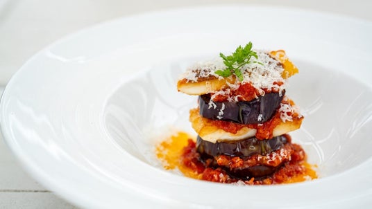 素材の良さを活かすため、佐土原ナスは素揚げして塩を軽く振り、しまうら真鯛はカリっとオリーブオイルでグリルしました。にんにくとベーコンのトマトソースは、じっくり時間をかけて煮込み、風味豊かな味わいに。トマトと相性が良いパルミジャーノチーズをかけて、よりリッチに仕上げました。