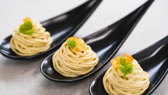 パティシエによる、パティシエ技法で、宮崎の伝統野菜「佐土原ナス」と昆布だし、牛乳、小麦粉、卵を合わせペースト状にしたものをモンブランのようにデコレーションし、イタリアの漁師町チェターラで生産される伝統的な魚醤「コラトゥーラ」をアクセントに仕上げました。ナスは定番の焼きナスや煮びたしなど和食に使用される事も多いですが、ケーキのような「前菜料理」を是非ご賞味ください。