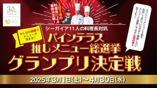フェニックス・シーガイア・リゾート(以下シーガイア/宮崎県宮崎市)グランドオープン30周年を記念して、昨年10月25日(金)~12月2日(月)に開催していた「パインテラス推しメニュー総選挙」。シーガイアの11名の料理長がエントリーし、総得票数14,589と、多くのお客様に投票へ参加いただき、上位3名が決定いたしました。