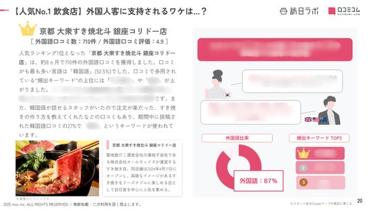 業界最大級のインバウンドビジネスメディア「訪日ラボ」及び 店舗向け集客一元化プラットフォーム「口コミコム」を運営する株式会社mov(代表取締役:渡邊 誠、本社:東京都渋谷区、以下mov)は、銀座エリアの飲食店に寄せられた最新の口コミデータから、独自の『インバウンド人気観光地ランキング』を発表しました。